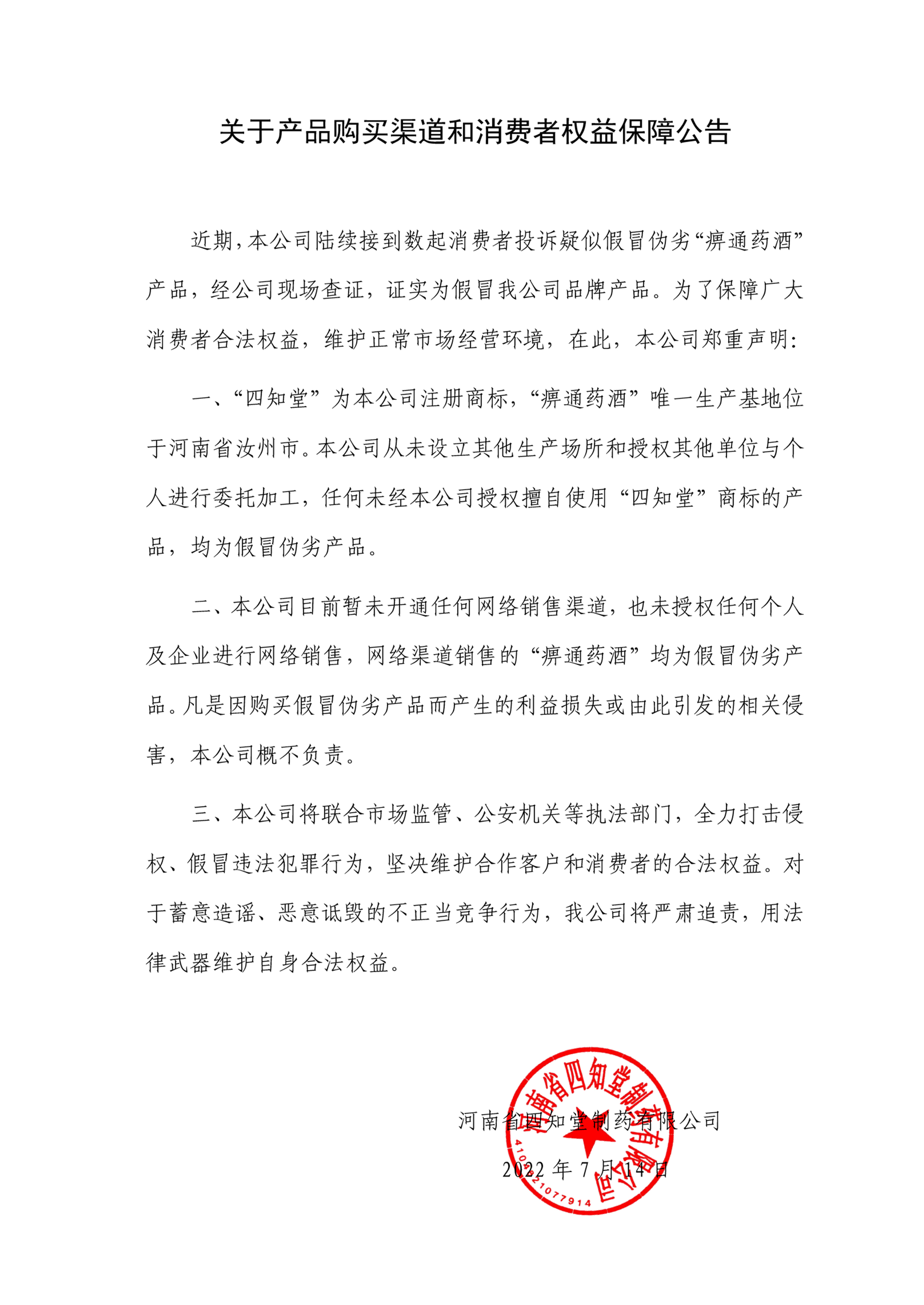 近期,本公司陆续接到数起消费者投诉疑似假冒伪劣“痹通药酒”产品,经公司现场查证,证实为假冒我公司品牌产品。为了保障广大消费者合法权益,维护正常市场经营环境,在此,本公司郑重声明:一、“四知堂”为本公